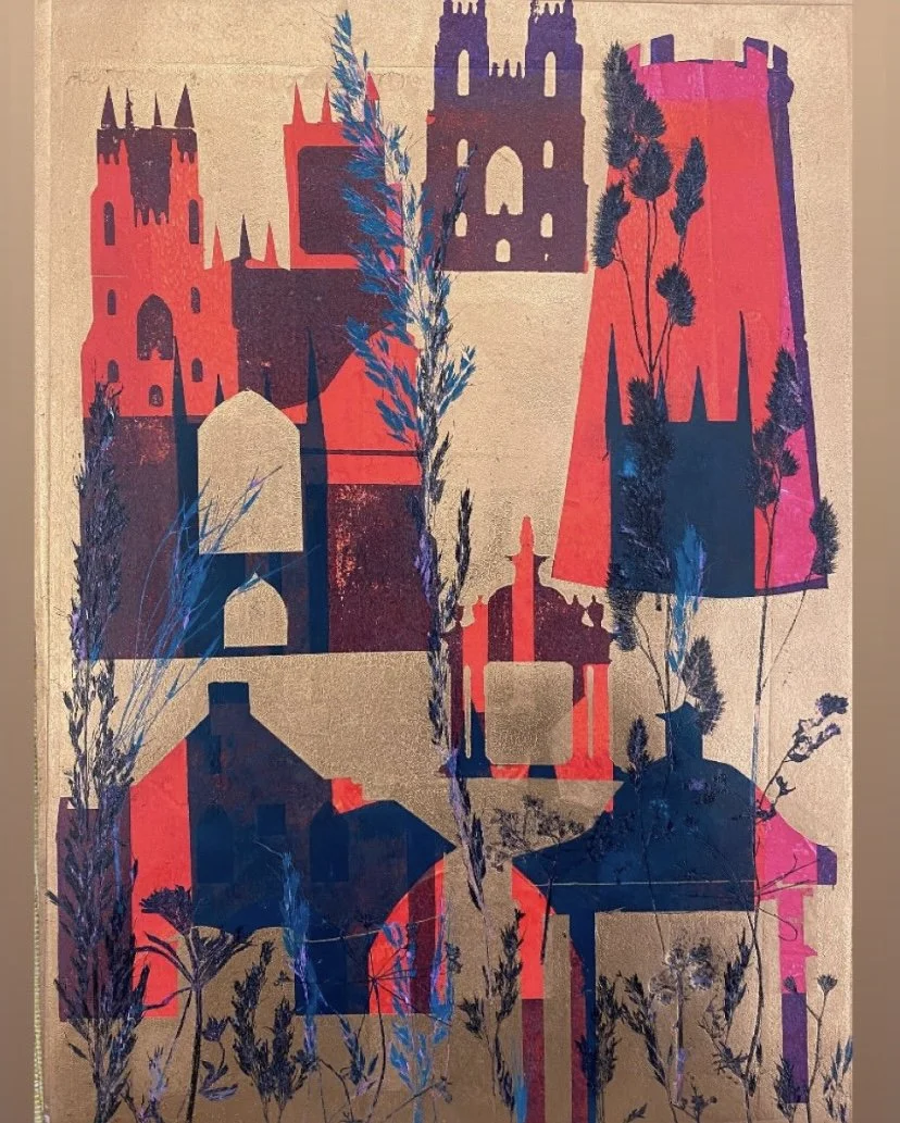 “Sanctuary Town” stencil print with botanicals by Susan Leeson