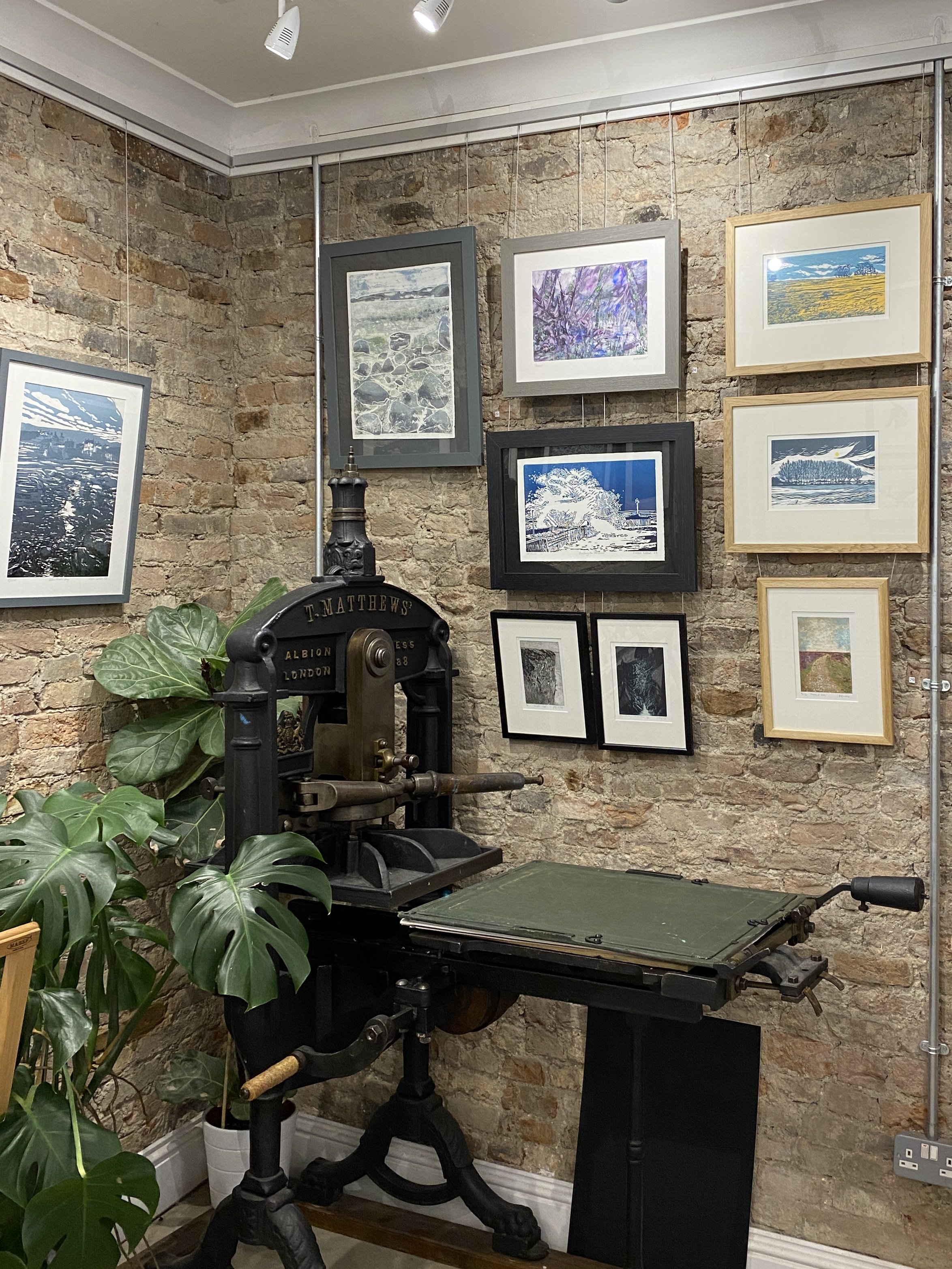 Susan’s been demonstrating collagraph printmaking in the gallery surrounded by these stunning original prints. If you haven’t visited yet, drop in – you too will soon be collecting scraps of wallpaper and other textured materials to create your own collagraph boards. Carol’s work is such an inspiration!