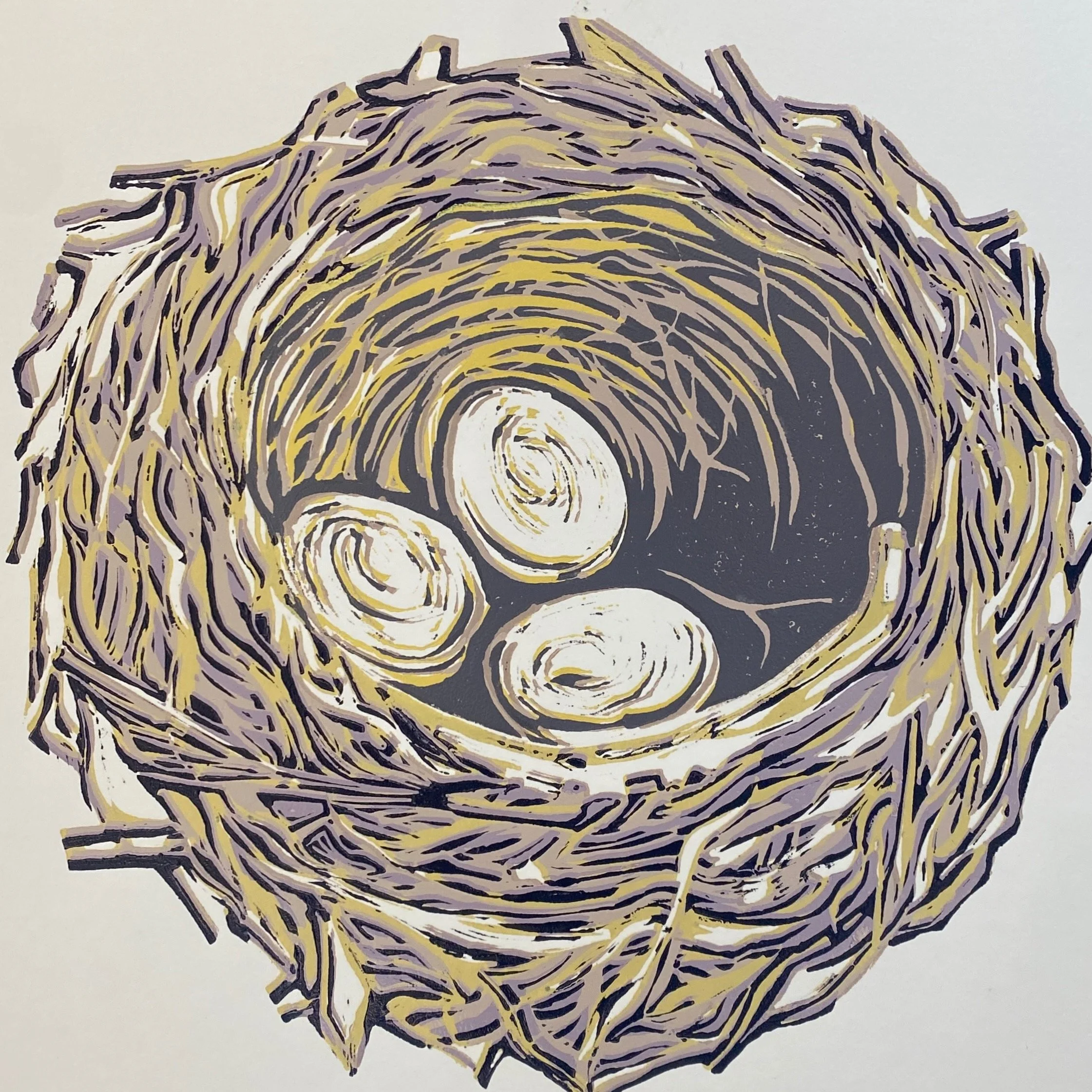 “Nest” reduction linocut by Maggie Moore