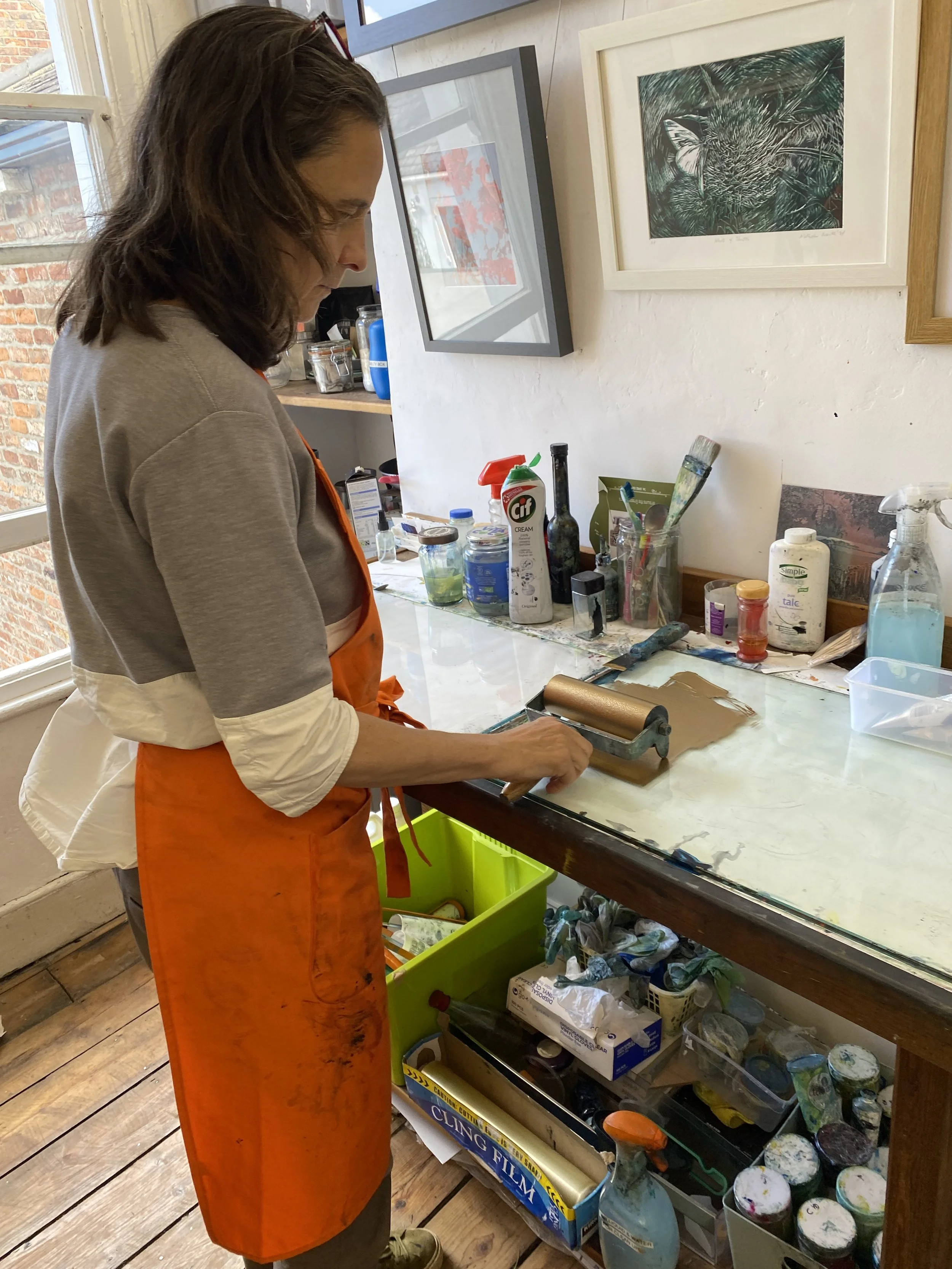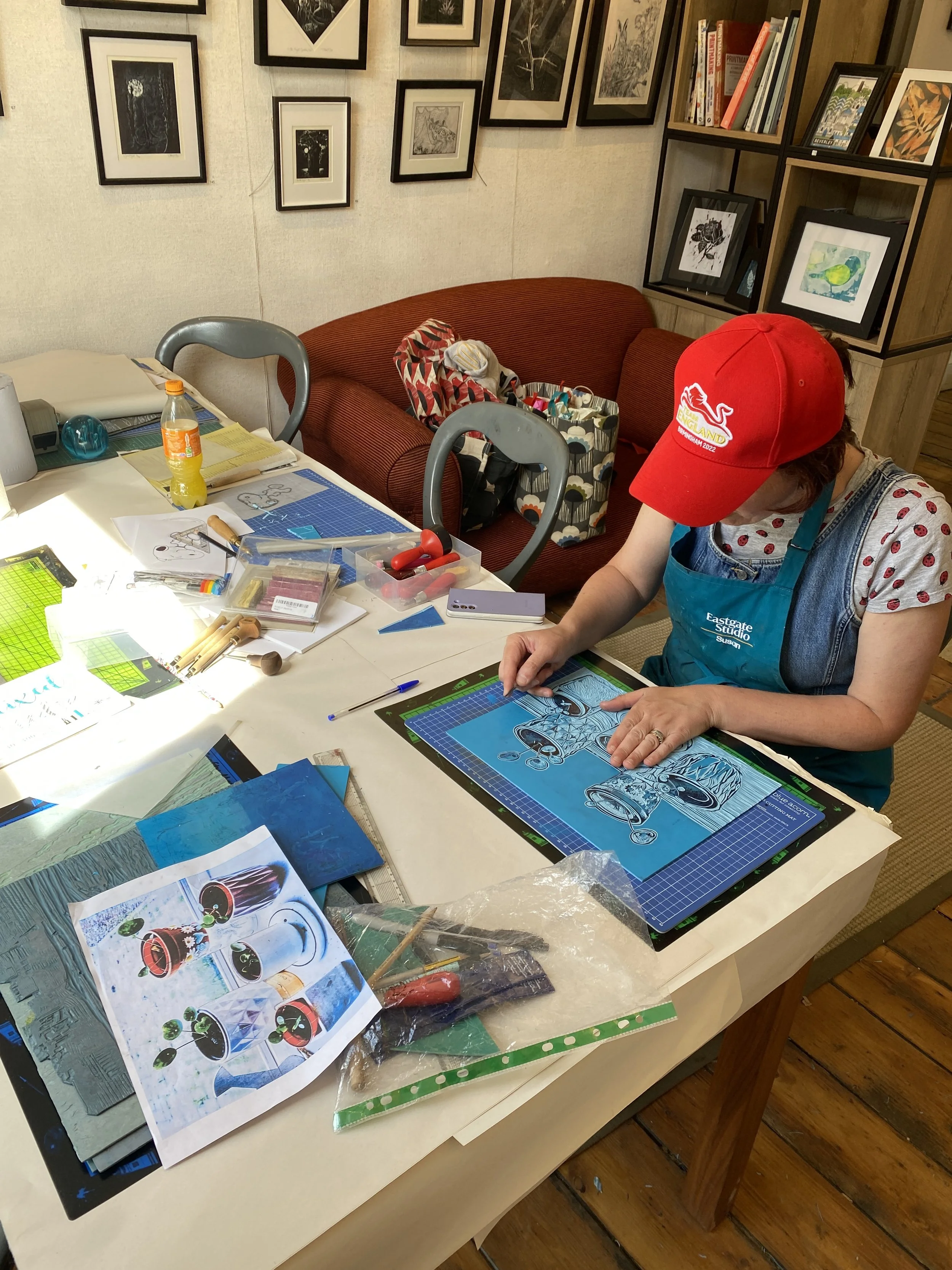 Liz Cawkwell linocut printmaking on the Albion Press at Eastgate Studio